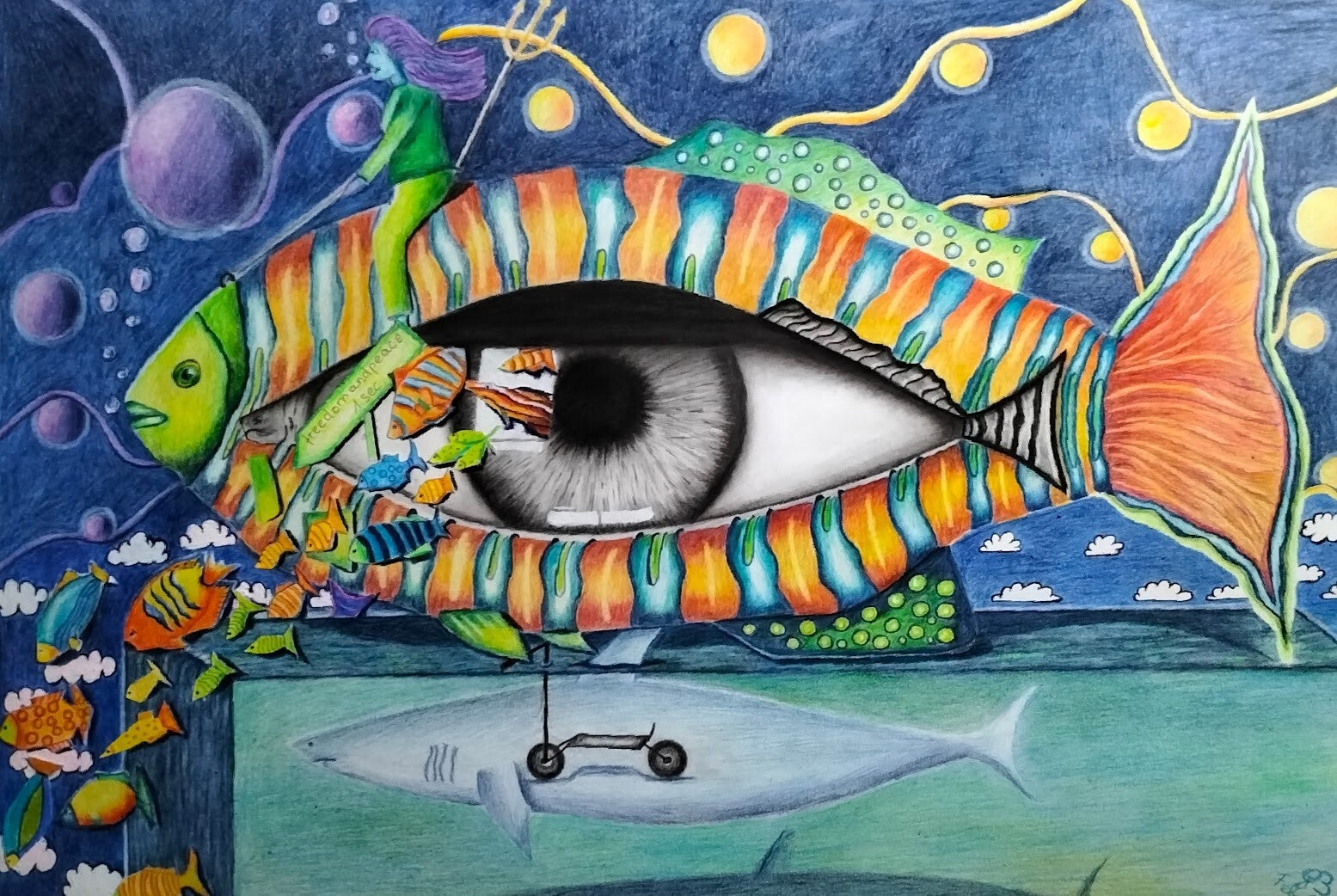 " Die Angst schwimmt immer mit" Mixed Media Collage, Bundstifte/Kohle/ Bleistift , Februar 2025, 60 mal 40cm