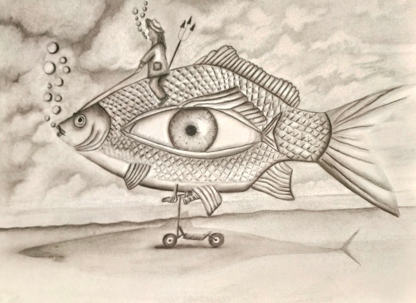 Vorzeichnung von " Die Angst schwimmt immer mit" DIN A 4, Bleistift, März 2025